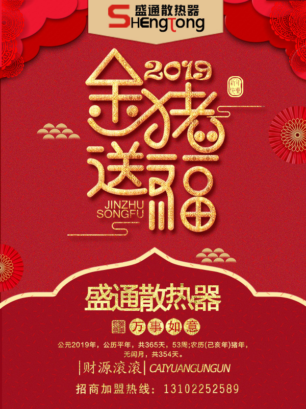 值此新年之際,盛通散熱器祝您:大財(cái)、小財(cái)、意外財(cái),財(cái)源滾滾;親情、友情、愛(ài)情,情情如意;官運(yùn)、財(cái)運(yùn)、桃花運(yùn),運(yùn)運(yùn)亨通;愛(ài)人、親人、友人,人人平安,新春快樂(lè)哦!